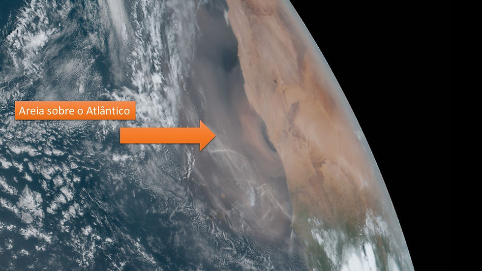 Na imagem do satélite Americano Goes 16, observa-se uma enorme macha de areai sobre a atmosfera no Oceano Atlântico.